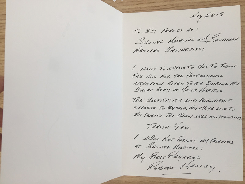Robert的妻子及朋友表示,從一開始的無助、驚慌到后來的親切、安心,這都有賴于順德醫(yī)院專家團(tuán)隊(duì)細(xì)心的診斷、精湛的醫(yī)術(shù)和無微不至的護(hù)理。Robert出院時在感謝信中寫下了這樣一段發(fā)自肺腑的話: I want to write to you to thank you for the professional attention to me during my short stay at your hospital. This hospitality friendship offered to myself, my wife to my friend TAI was outstanding!THANK YOU!【我寫這封信是為了感謝你們在我這次短暫住院的過程中對我的專業(yè)照護(hù)。這次的住院經(jīng)歷和友誼關(guān)系的建立,對于我自己、我妻子以及朋友TAI來說,真的非常非常棒!十分感謝你們!】