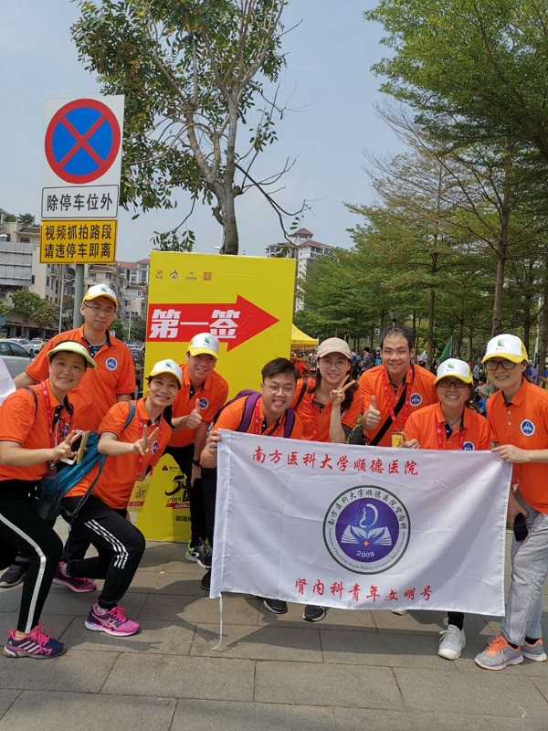 Z 先生所在的徒步隊(duì)伍,有40多人,他們穿著整齊劃一的服裝,打著鮮明惹眼的旗幟,乍一看和其他隊(duì)伍沒(méi)什么分別,實(shí)際上他們當(dāng)中有平時(shí)沖鋒在一線救死扶傷的醫(yī)護(hù)人員,有罹患慢性腎臟病正在接受治療的“腎友”,也有長(zhǎng)期依靠透析維持生命的“透友”,也有病患家屬,他們共同組成了這支特殊的徒步方隊(duì)——南方醫(yī)科大學(xué)順德醫(yī)院腎內(nèi)科愛(ài)腎健步行團(tuán)隊(duì)。