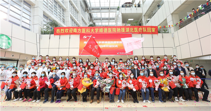 4月6日上午11:00時(shí),我院在門診大堂舉行簡(jiǎn)單而溫馨的援鄂醫(yī)療隊(duì)勝利歸回歡迎儀式。南方醫(yī)科大學(xué)寧習(xí)洲副校長、順德區(qū)人民政府招霞紅副區(qū)長、順德區(qū)衛(wèi)生健康局葉少紅副局長、陳抒豪副局長、鄭丹瑜副局長、鄭華嬰副局長等領(lǐng)導(dǎo),及我院黨政班子領(lǐng)導(dǎo)出席儀式。雖是清明假期,但是我院超過300多人特意趕回醫(yī)院,迎接英雄,向英雄們致意。家屬們準(zhǔn)備了鮮花,翹首以盼。家人們齊聚一堂,迎接抗疫英雄回家,共襄這場(chǎng)春日里的盛宴。