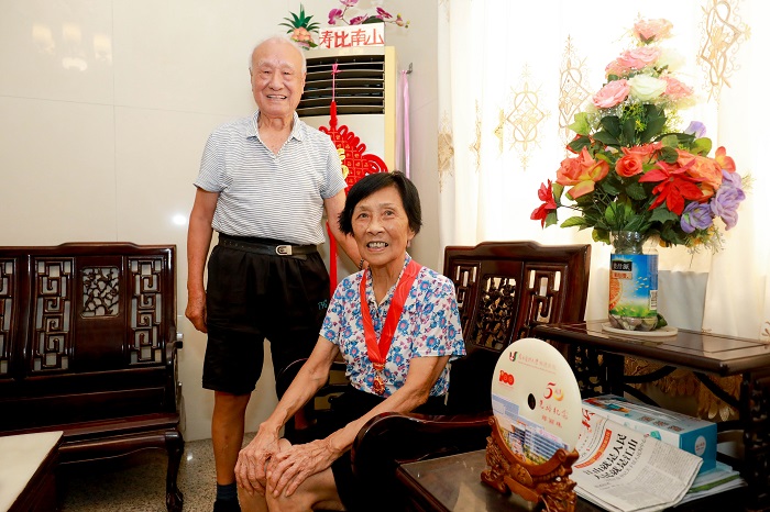 鄭麗珠是醫(yī)院內(nèi)科系統(tǒng)的老專家,在老伴的陪伴下接過了紀(jì)念章和紀(jì)念盤,當(dāng)?shù)弥o(jì)念章是中共中央頒發(fā)給自己的時(shí)候,二老顯得非常激動(dòng)和自豪。