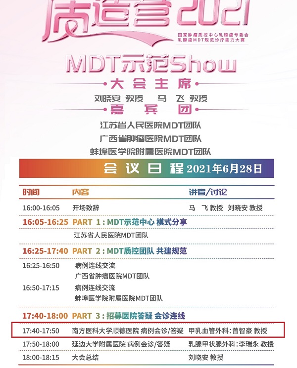6月28日,曾智豪主任醫(yī)師受邀參加國家腫瘤質(zhì)控中心乳腺癌專委會主辦的乳腺癌2021質(zhì)造營MDT示范SHOW,對疑難病例進(jìn)行會診討論。