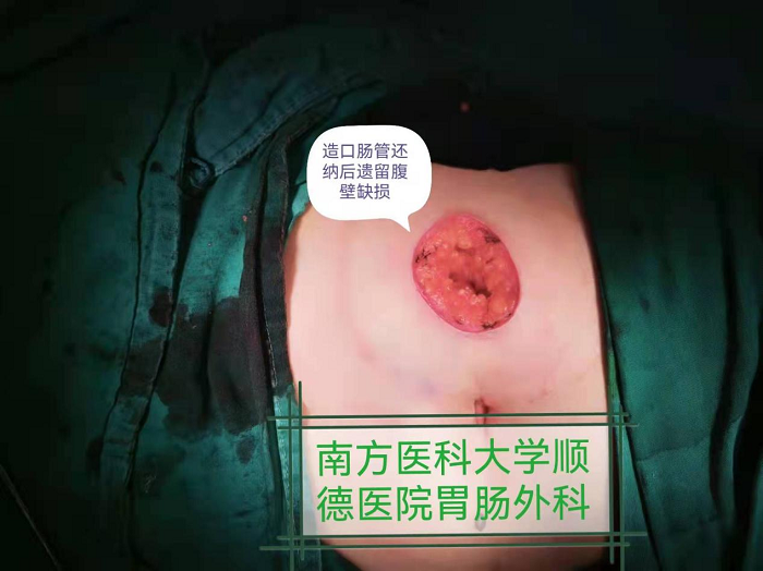 筆者曾經歷過多例還納術后患者出現傷口感染,最終導致切口疝而進行多次手術。為了降低還納術后傷口感染率,在胃腸外科科主任劇永樂教授的指導下,查閱了國內外大量的文獻,決定采用自身組織新技術進行修復造口還納術遺留的腹壁缺損,經臨床實踐證明,新技術既能妥善修復還納術后腹部缺損創(chuàng)面,也能降低術后傷口感染發(fā)生率,經隨訪,患者傷口外形滿意,舒適度明顯優(yōu)于傳統縫合傷口,手術效果顯著。