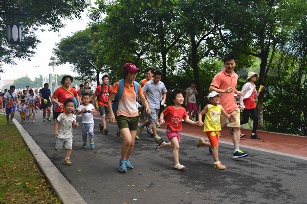 約45分鐘后,一對父子沖向了終點,在眾多游客的歡呼聲中,完成了親子健步行的沖刺,他們奪得了今天的冠軍。隨后,一組組家庭用健步走完了全程,來到了終點。