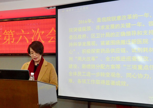 鐘劍萍院長(zhǎng)以《與時(shí)俱進(jìn) 銳意改革 譜寫(xiě)醫(yī)院發(fā)展新篇章》為題,對(duì)醫(yī)院2016年工作做了全面總結(jié);龍兆麟副院長(zhǎng)向全體代表報(bào)告了2016年醫(yī)院財(cái)務(wù)決算、員工分配情況及2017年財(cái)務(wù)預(yù)算;劉映南書(shū)記在大會(huì)上提出了2017年工作目標(biāo)和計(jì)劃,同時(shí),就全院職工前期提出的問(wèn)題作了回復(fù)。